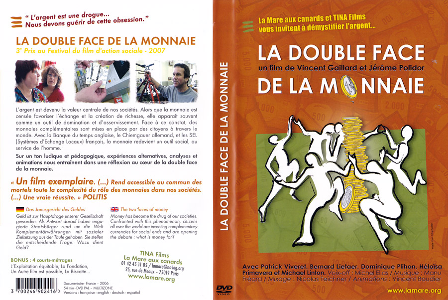 L’argent est devenu la valeur centrale de nos sociétés. Alors que la monnaie est censée favoriser l’échange et la création de richesse, elle apparaît souvent comme un outil de domination et d’asservissement. Face à ce constat, des monnaies complémentaires sont mises en place par des citoyens à travers le monde. Avec la Banque du temps anglaise, le Chiemgauer allemand, et les SEL (systèmes d’échange locaux) français, la monnaie redevient un outil social au service de l’homme. Sur un ton ludique et pédagogique, expériences alternatives, analyses et animations nous entraînent dans une réflexion au coeur de la double face de la monnaie.