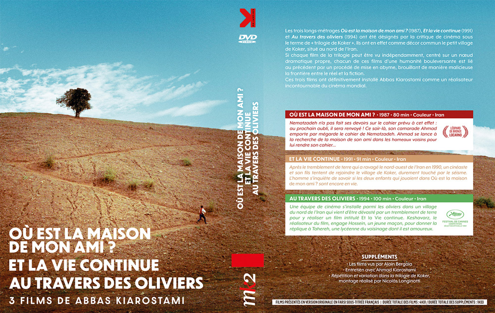 Les trois longs métrages Où est la maison de mon ami ? (1987 - 1h20), Et la vie continue (1991 - 1h31) et Au travers des oliviers (1994 - 1h40) ont été désignés par la critique de cinéma sous le terme de "trilogie de Koker". Ils ont en effet comme décor commun le petit village de Koker, situé au nord de l'Iran. Si chaque film de la trilogie peut être vu indépendamment, centré sur un noeud dramatique propre, chacun de ses films d'une humanité bouleversante est lié au précédent par un procédé de mise en abyme, brouillant de manière malicieuse la frontière entre le réel et la fiction.